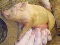 La atracción para chicos y grandes fueron una chancha amamantando a sus diez cerditos y un ternerito mamando la teta de su madre.