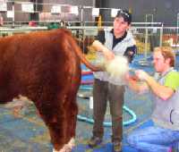 El servicio de belleza que se les prodiga a los toros antes de exponerlos: se los sopletea con aire para eliminar la suciedad del pelaje, luego se les pasa un peine metálico, se peina también la cola, batiendo sus pelos para armar una especie de pompón y por último se rocía al animal con una brillantina perfumada, que los deja impecables.