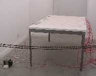 Algo escalofriante es una mesa blanca, cruzada por alambres conectados a electricidad a través de un transformador. La llamada "parrilla" donde se torturaba. La muestra es un terrible recuerdo de los desaparecidos, como tema central, que se hace presente en las distintas obras, donde no falta el "Falcon" y el río, que fue una de las sepulturas elegidas en la época de la represión.